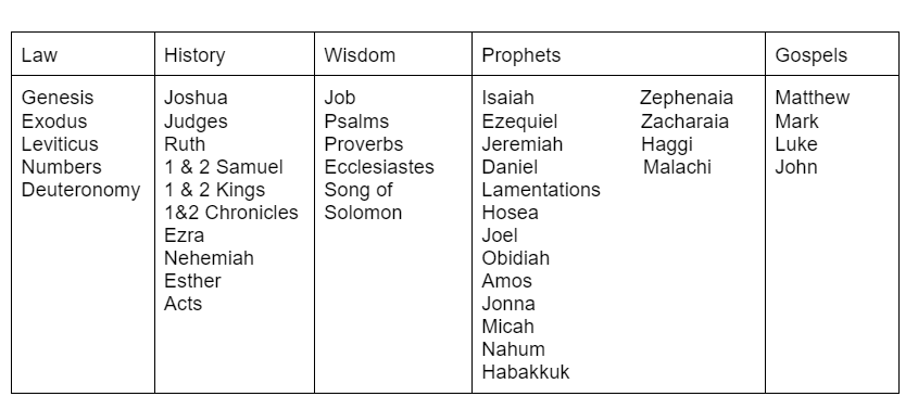 The Bible is not simply a book. It is a collection of books, 66 to be exact, with 40 different authors, written in different time periods and places, written in 3 different languages, with one central message. That message is “How God saves humanity from sin.” The Bible is divided into two major parts. The Old Testament (OT) and The New Testament (NT). You probably already knew that but, the books in the OT and NT also have different subsections within them. Understanding that is an important part of understanding what you’re reading. Now I won’t go through every book of the Bible. But I want to break down some sections and give a broad overview of them. I’ve also created a table at the bottom of this blog to give a better visual.